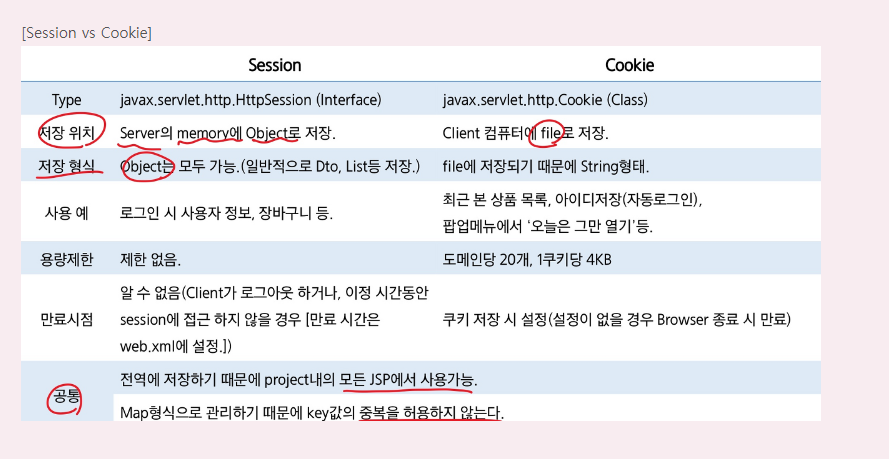 [Session] - 방문자가 웹 서버에 접속해 있는 상태 - WAS의 메모리에 Object의 형태로 저장 - 메모리가 허용하는 용량까지 제한없이 저장가능 [동작순서] - 클라이언트가 페이지 요청 - 접근한 클라이언