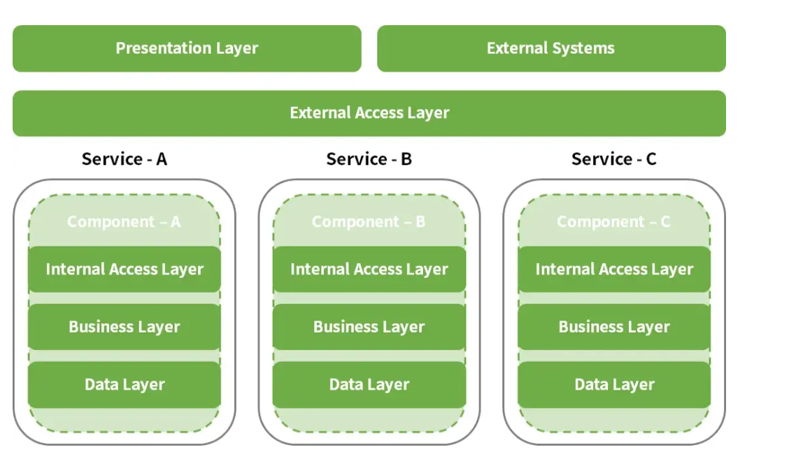 컴포넌트들이 작은 서비스의 단위로 분리되어 독립적으로 배포됨. 서비스의 경우 보통 도메인을 기준으로 나눔.