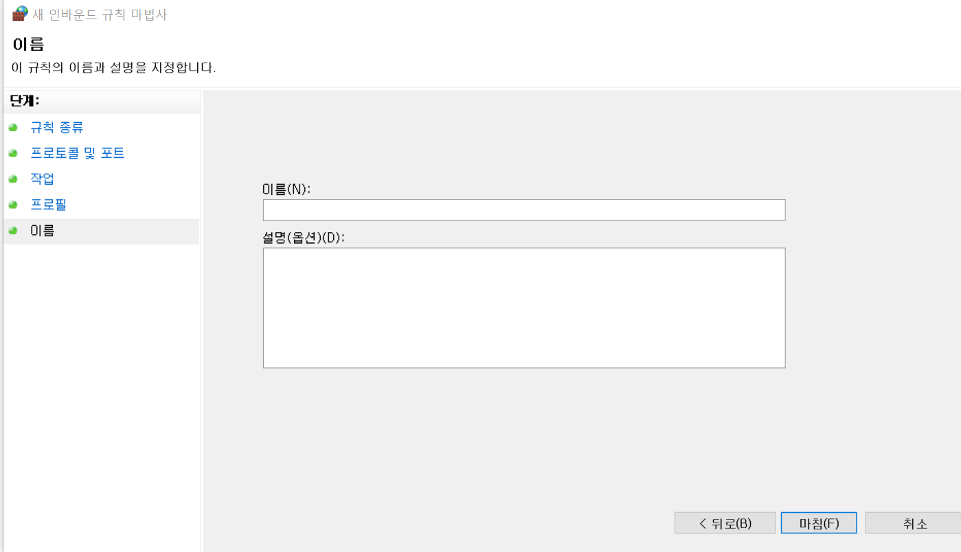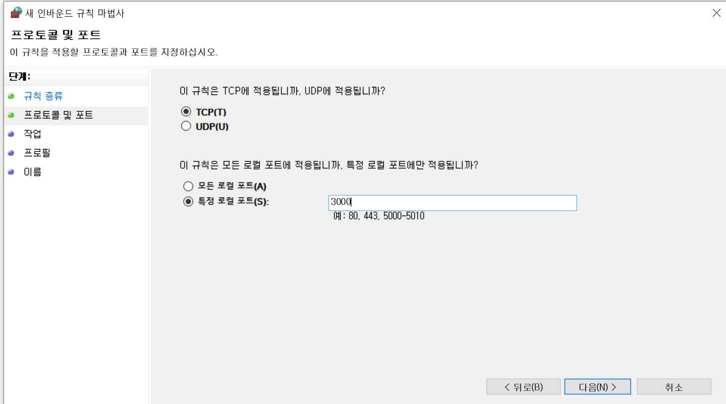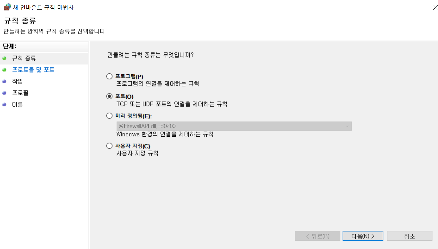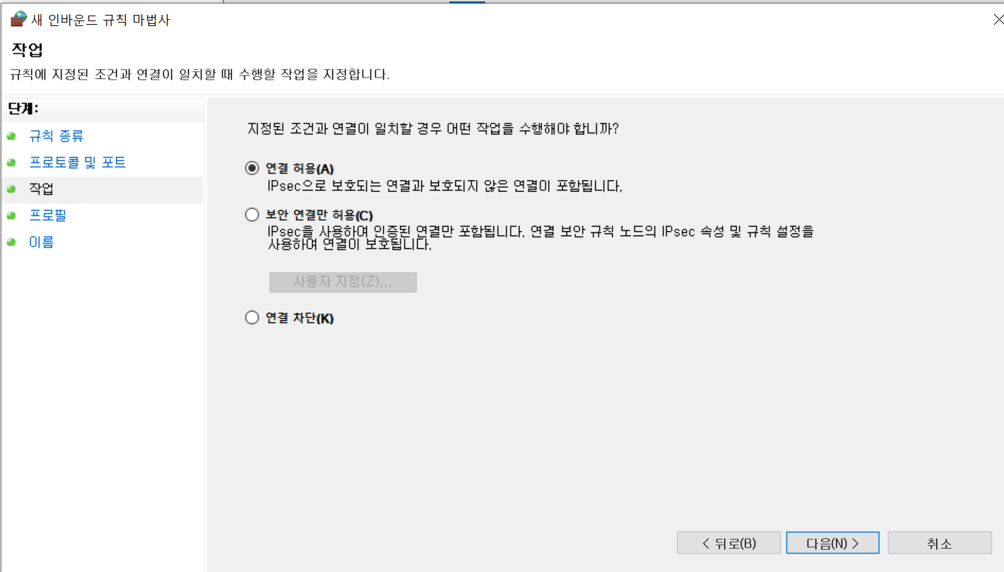 윈도우 쪽 인바운드 규칙에서 포트를 열어주어야 들어갈 수 있다는 정보를 확인 한다음, 적용 후 테스트를
