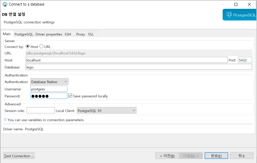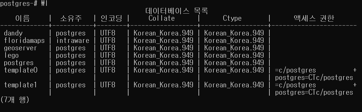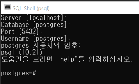 # psql에서 접속 및 만들어준 이름으로 접속 정보 입력