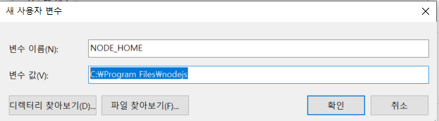 변수 이름 : NODE_HOME , 변수 값 : C:\Program Files\nodejs 확인
