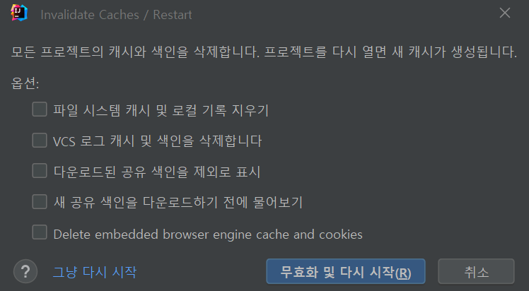 2. 파일 - 캐시 무효화 - 무효화 및 다시시작