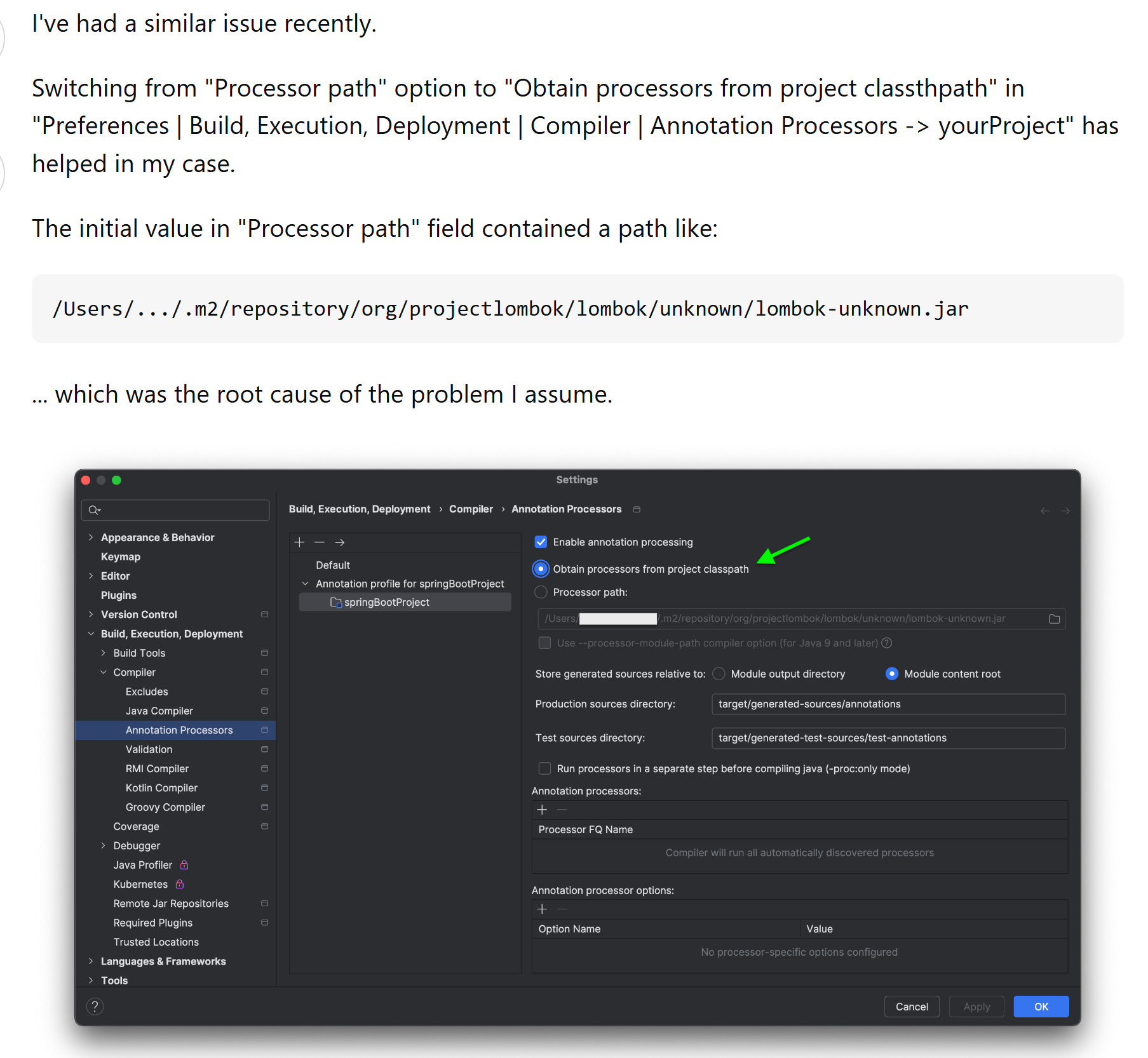 => intelli > 파일 > 설정 > 빌드, 실행, 배포 > 컴파일러 > 어노테이션 프로세서 > 해당 프로젝트 선택 > 좌측 어노테이션 처리 활성화 및 프로젝트 클래스 경로에서 프로세서 가져오기 체크