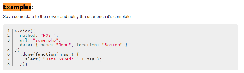 소스 뜻 : some.php url에 data인 name의 벨류 존과 location 벨류 보스턴의 파라미터를 post 방식으로 던짐.