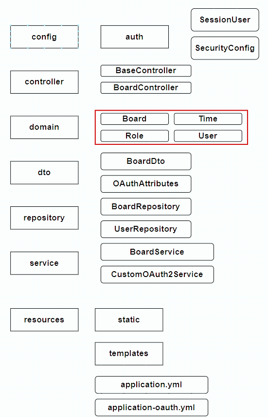domain 패키지에는 Board, Time, Role, User 4개의 파일이 존재하게 된다.