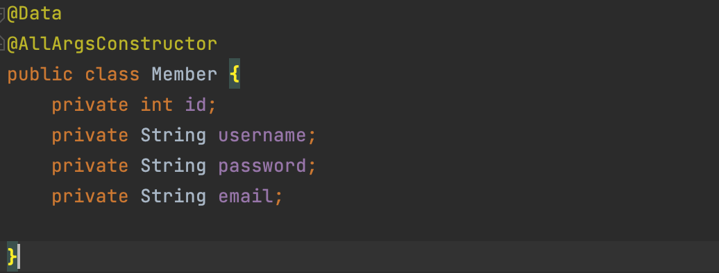 생성된 모든 멤버변수(username, password, email)를 인자로 받는 생성자를 만드는 Annotation