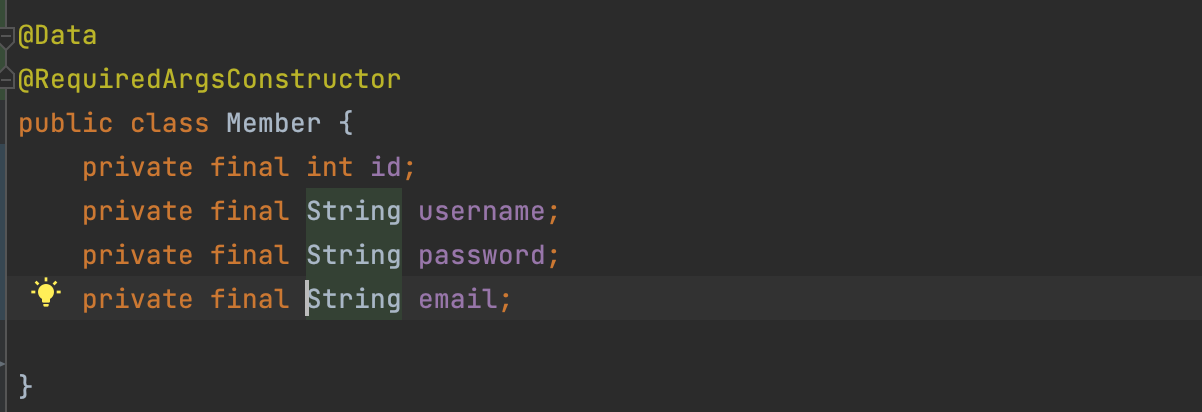Class를 만들 때 필수적인 멤버 변수(final 변수)를 인자로 받는 생성자를 만든다. (객체의 멤버 변수 값이 수정될 일이 없는 클래스일 경우)