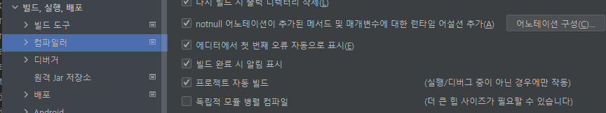 파일 - 설정 - 빌드, 실행, 배포, 컴파일러